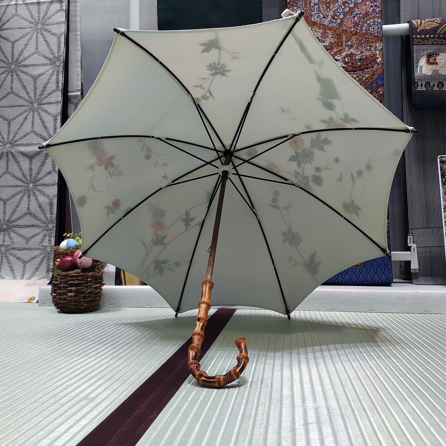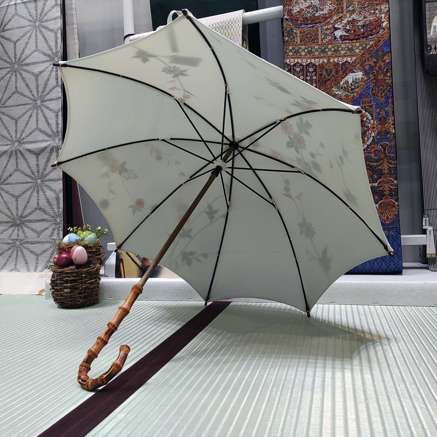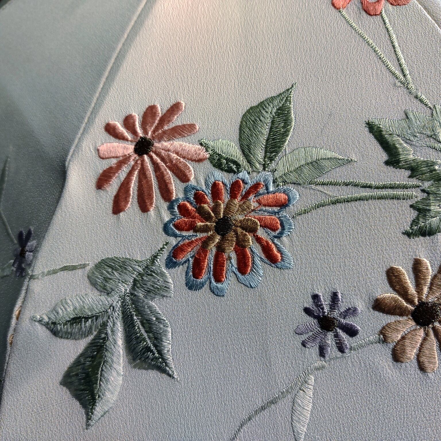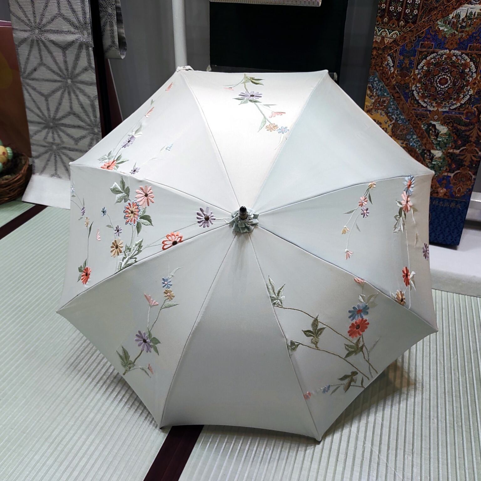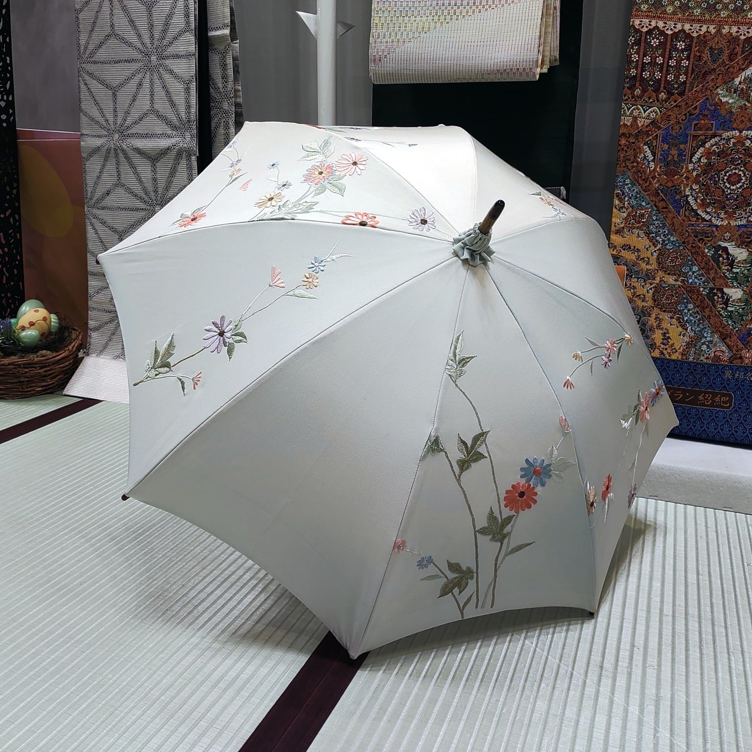 日本の伝統美と花の美しさを組み合わせた、花柄の刺繍の日傘です。お着物にもよく似合う花柄の刺繍が施され、上品で華やかな印象を与えます。生地の本体は、薄いベージュと水色の組み合わせで、さわやかな雰囲気を演出します。