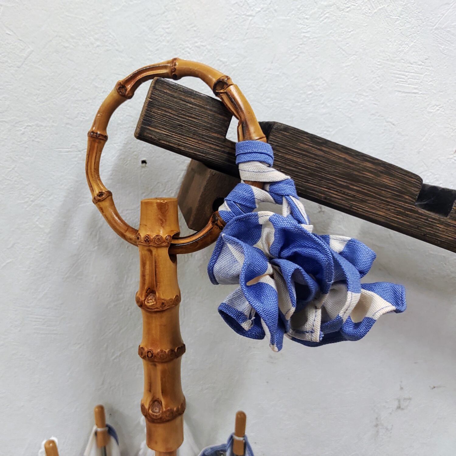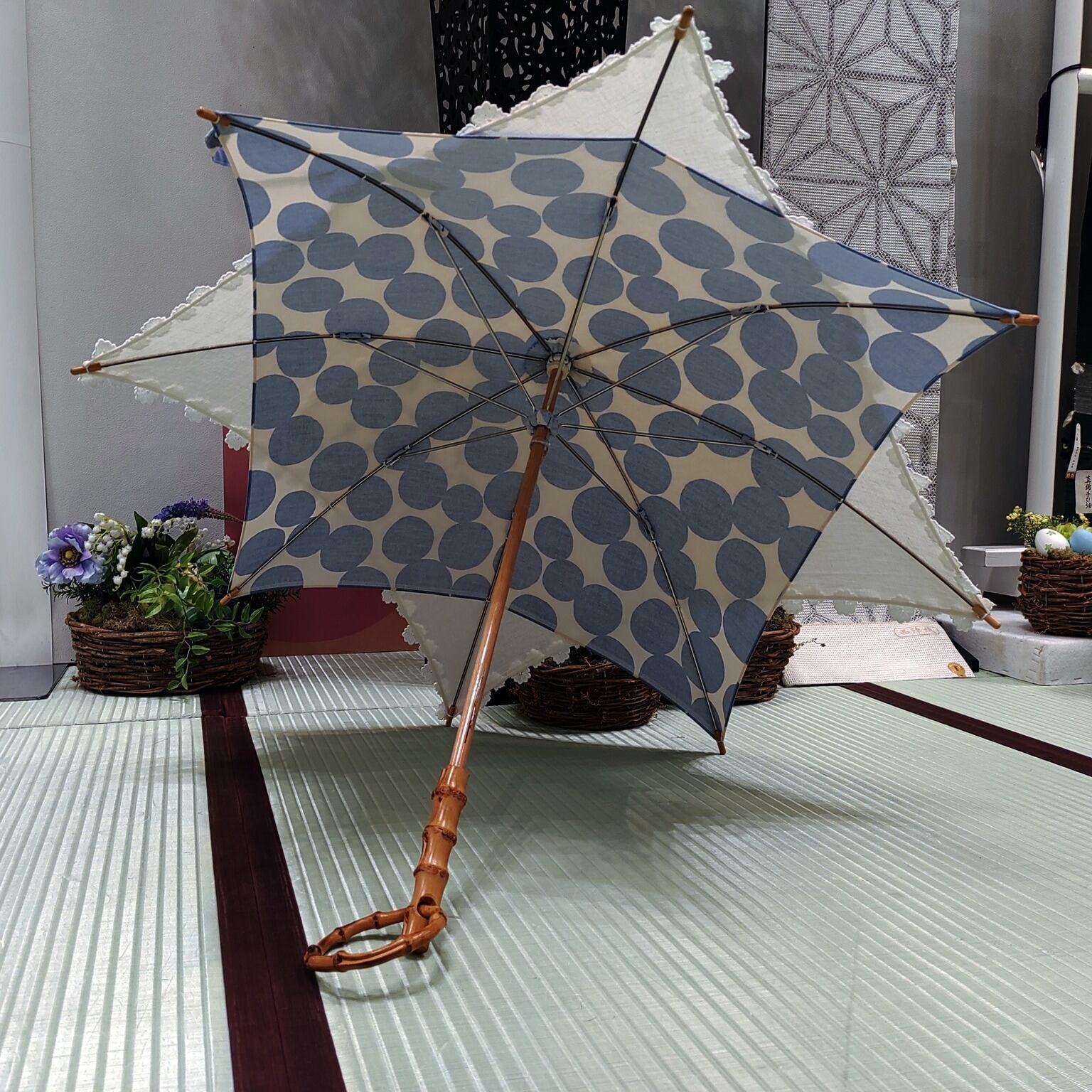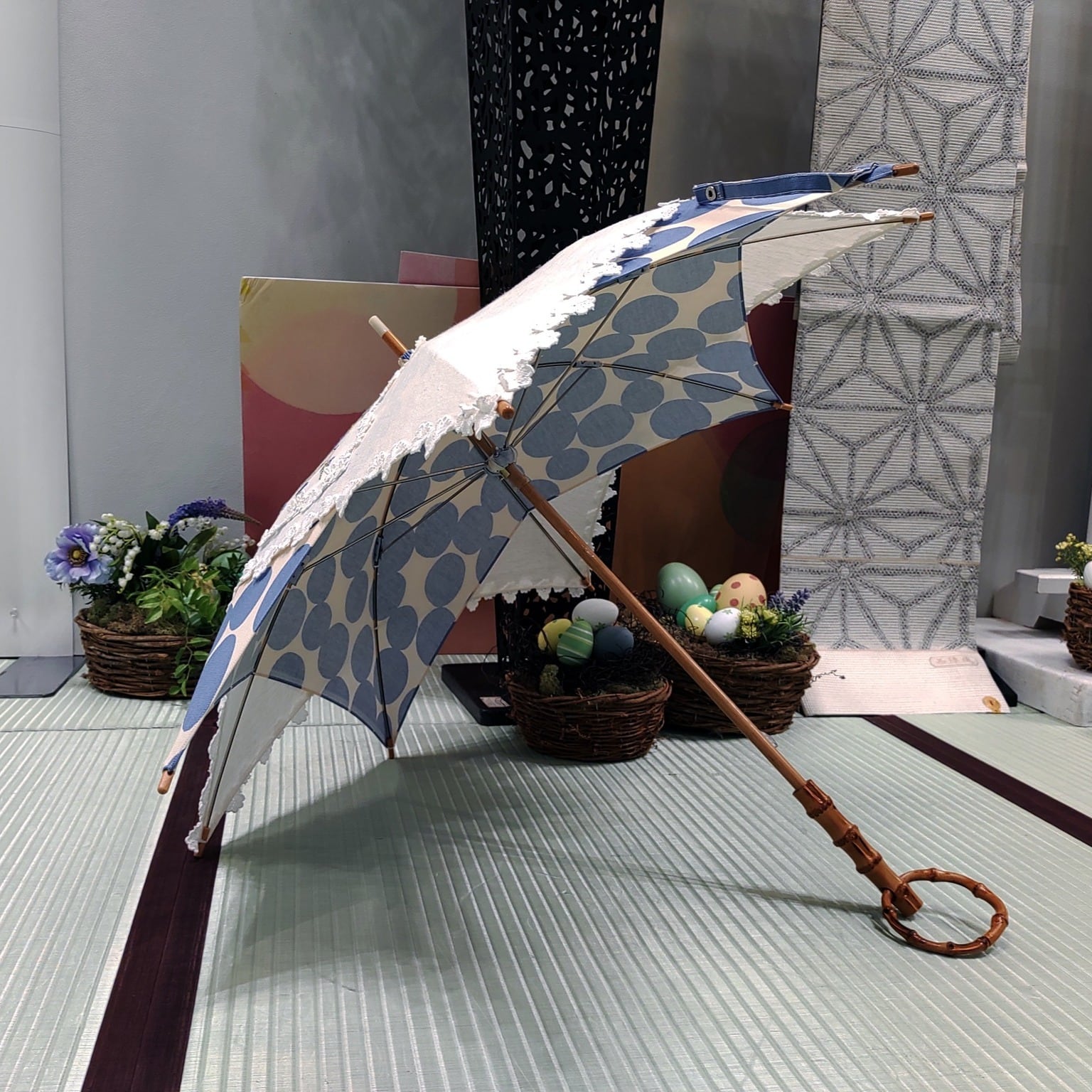 手元にはリングタイプの寒竹を、共布で作った「アトリエすずきの洋傘」オリジナルのお花ボンボンも取り付けました。
