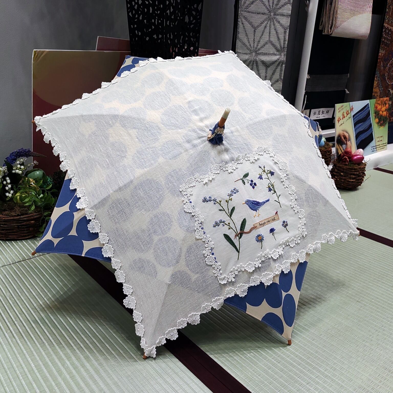 繊細なフランス刺繍が施されたスクエアデザインの日傘、それがこの一枚です。