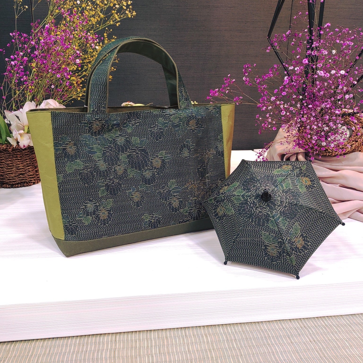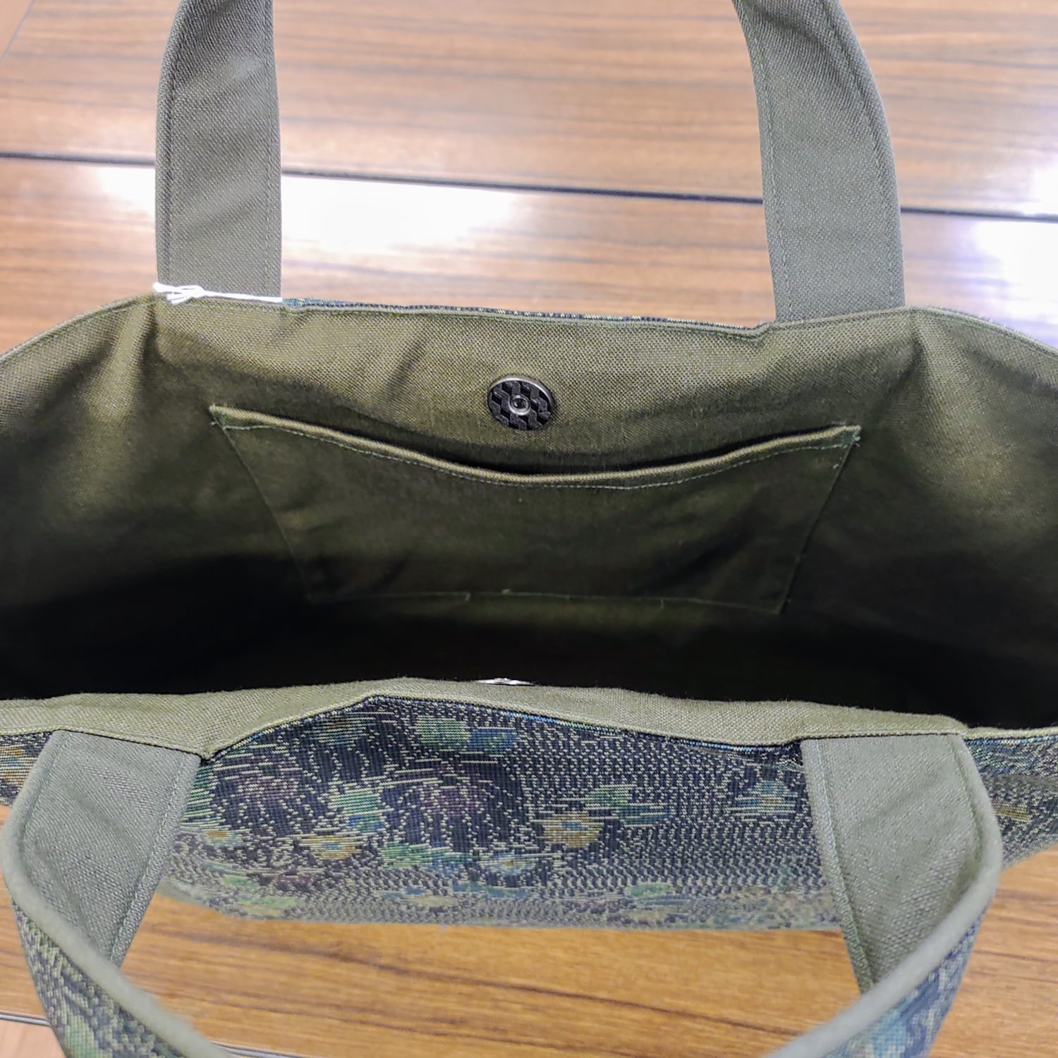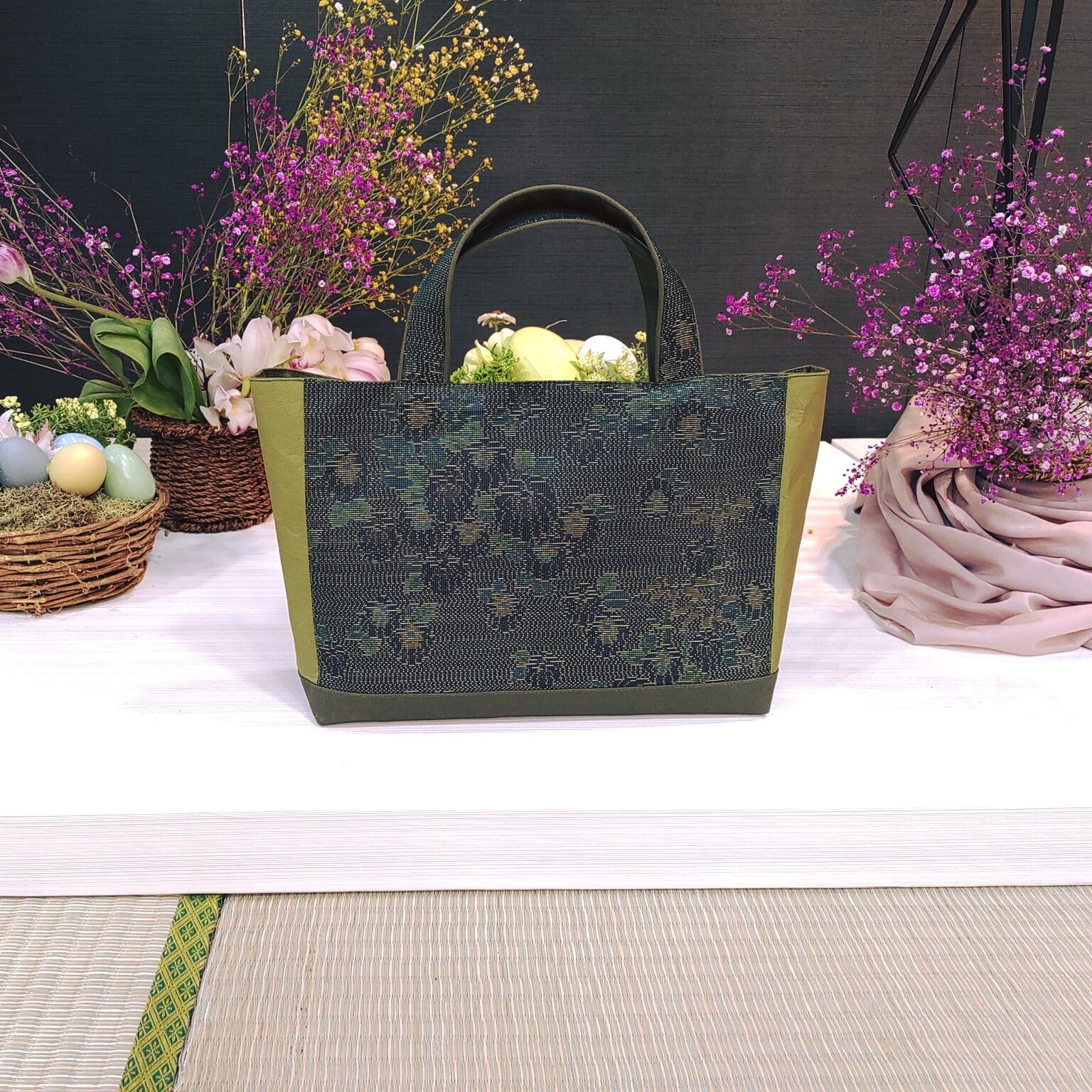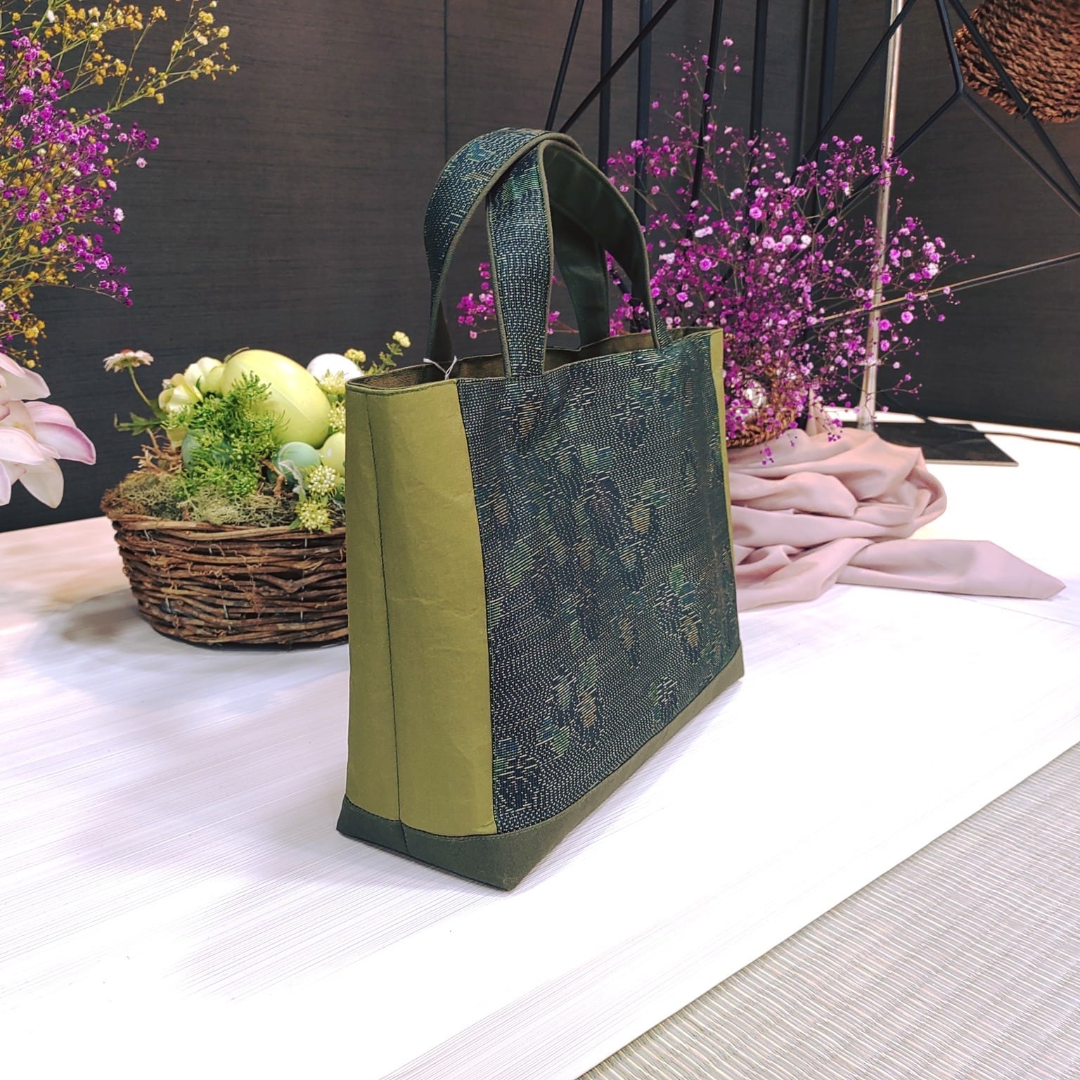 このトートバッグは、お着物の風合いと洋服の使い勝手を組み合わせた、ユニークなアイテム。そのため、普段使いから特別な日まで、様々なシーンで活躍してくれること間違いなしです。緑のお着物の魅力を存分に楽しみながら、お洒落をお楽しみください。