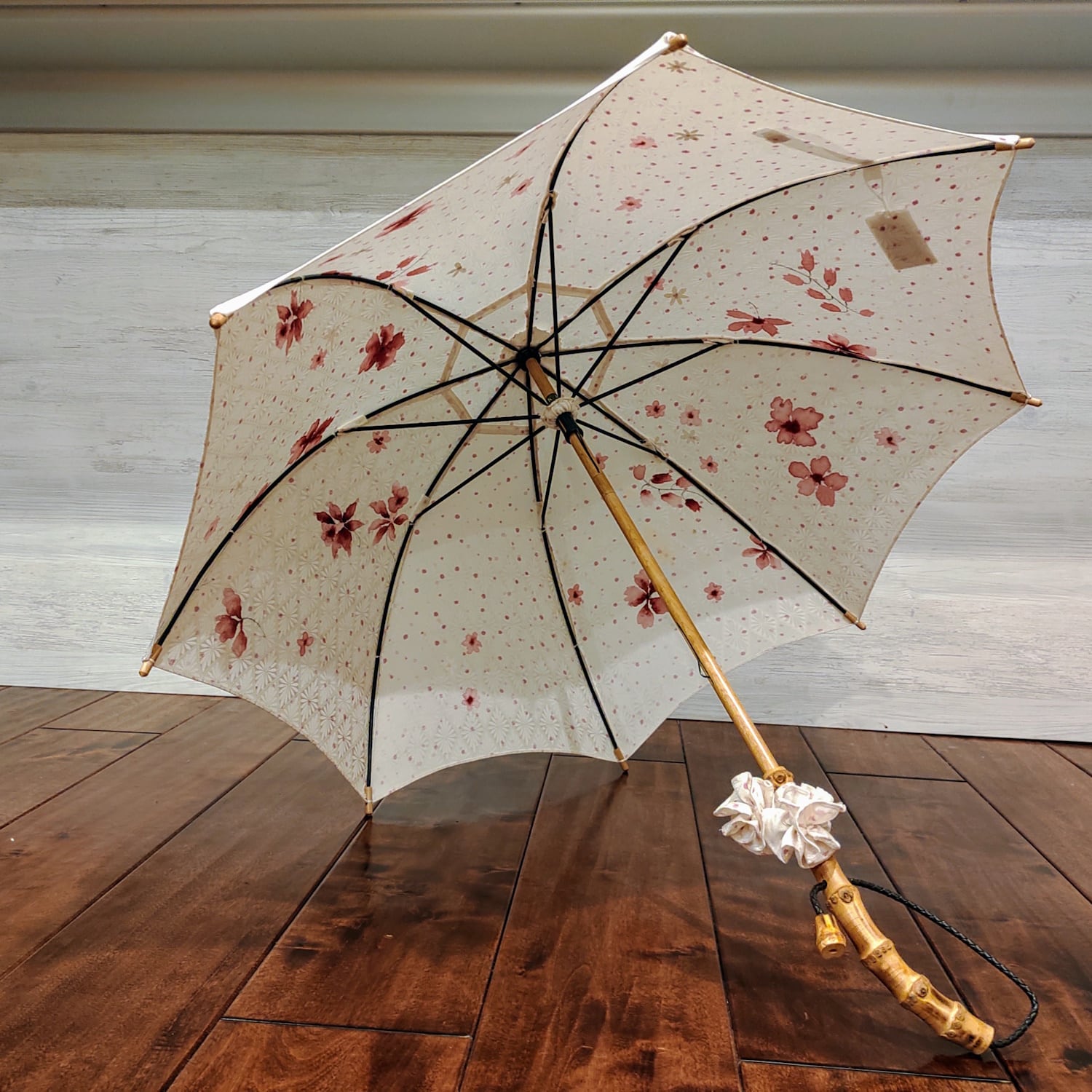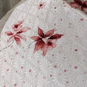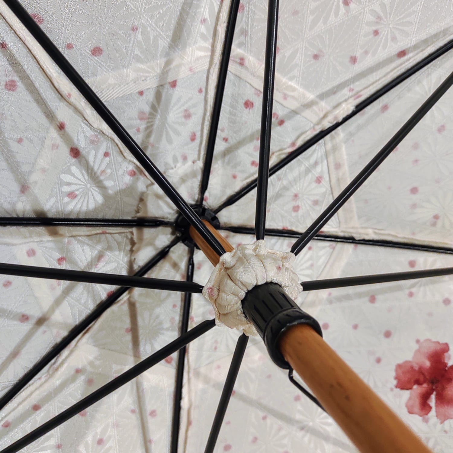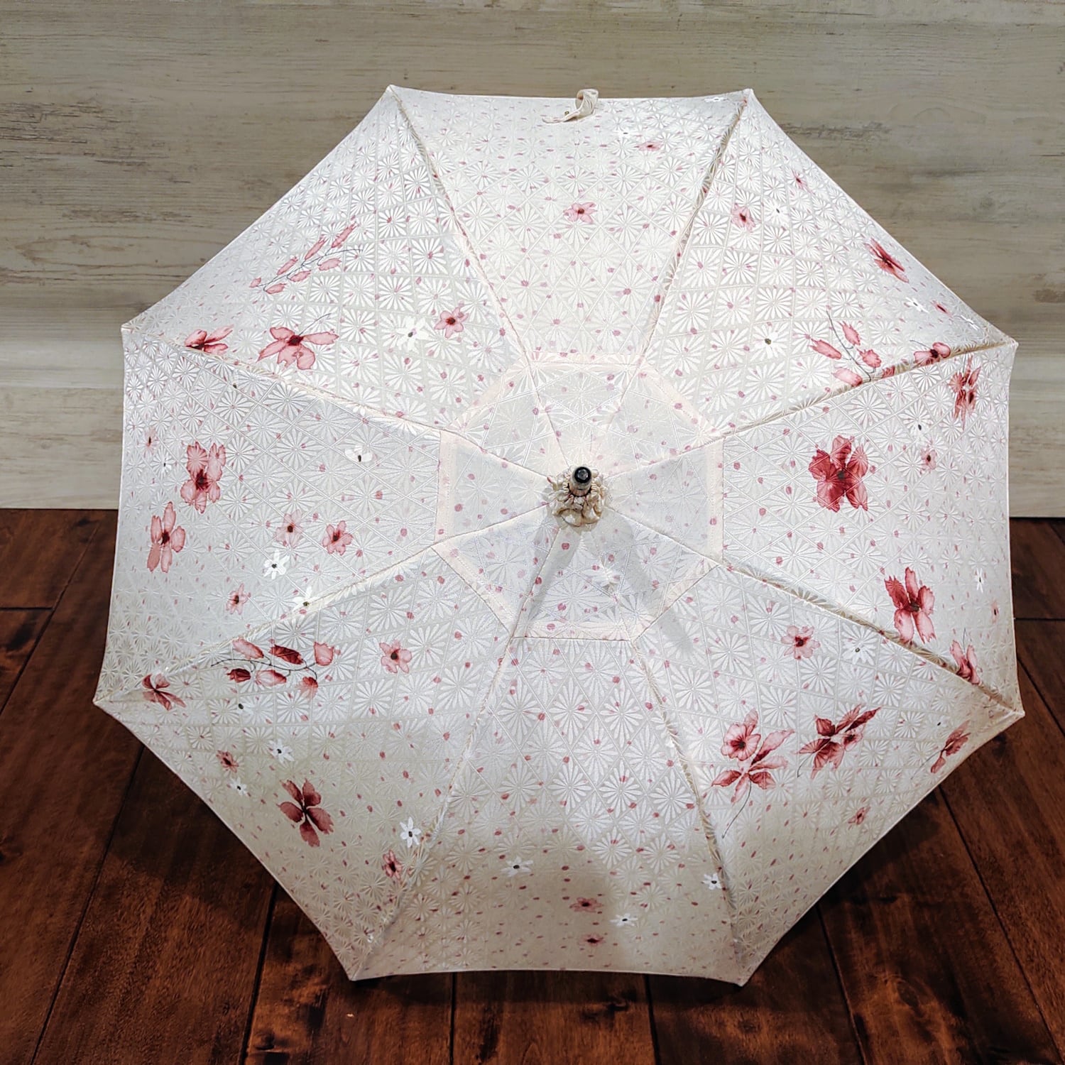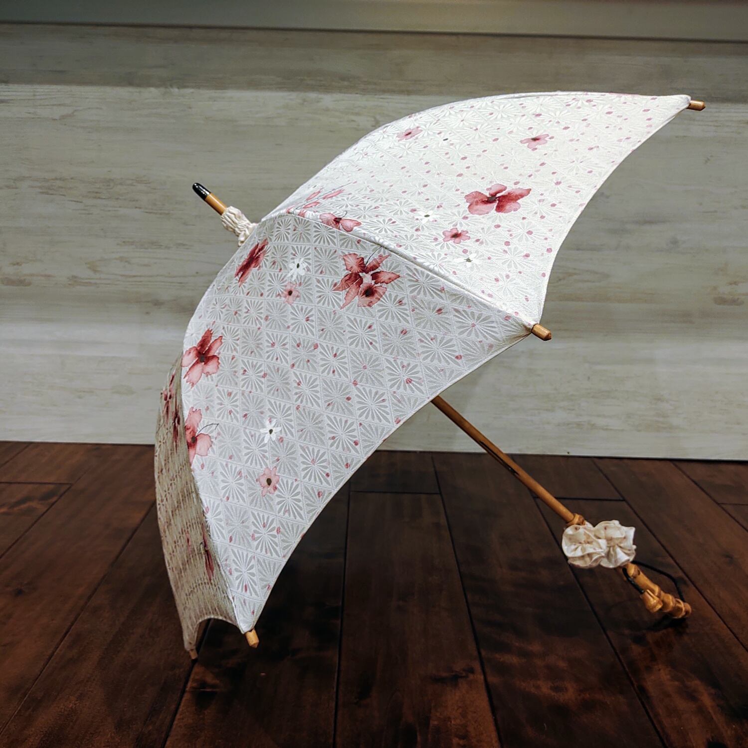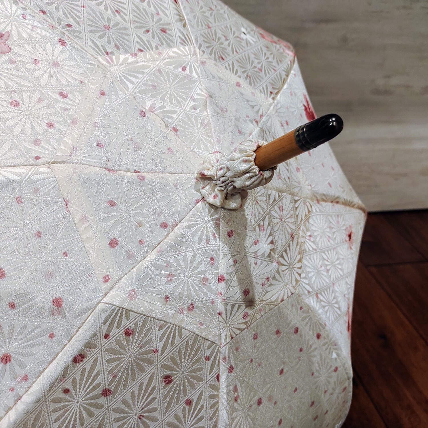 光沢のあるオフホワイトの生地に美しい赤色の花柄をあしらった、和の美しさが漂う日傘をご紹介します。お着物から仕立てた、繊細で風情あるデザインが特徴です。光の当たり方によって、白い花の柄が浮かび上がるような表情を楽しめます。日傘の中心部には生地の向きを変えて切り返し縫いで繋いでいるため、こちらも光の当たり方で微妙に色合いが異なるように見えます。