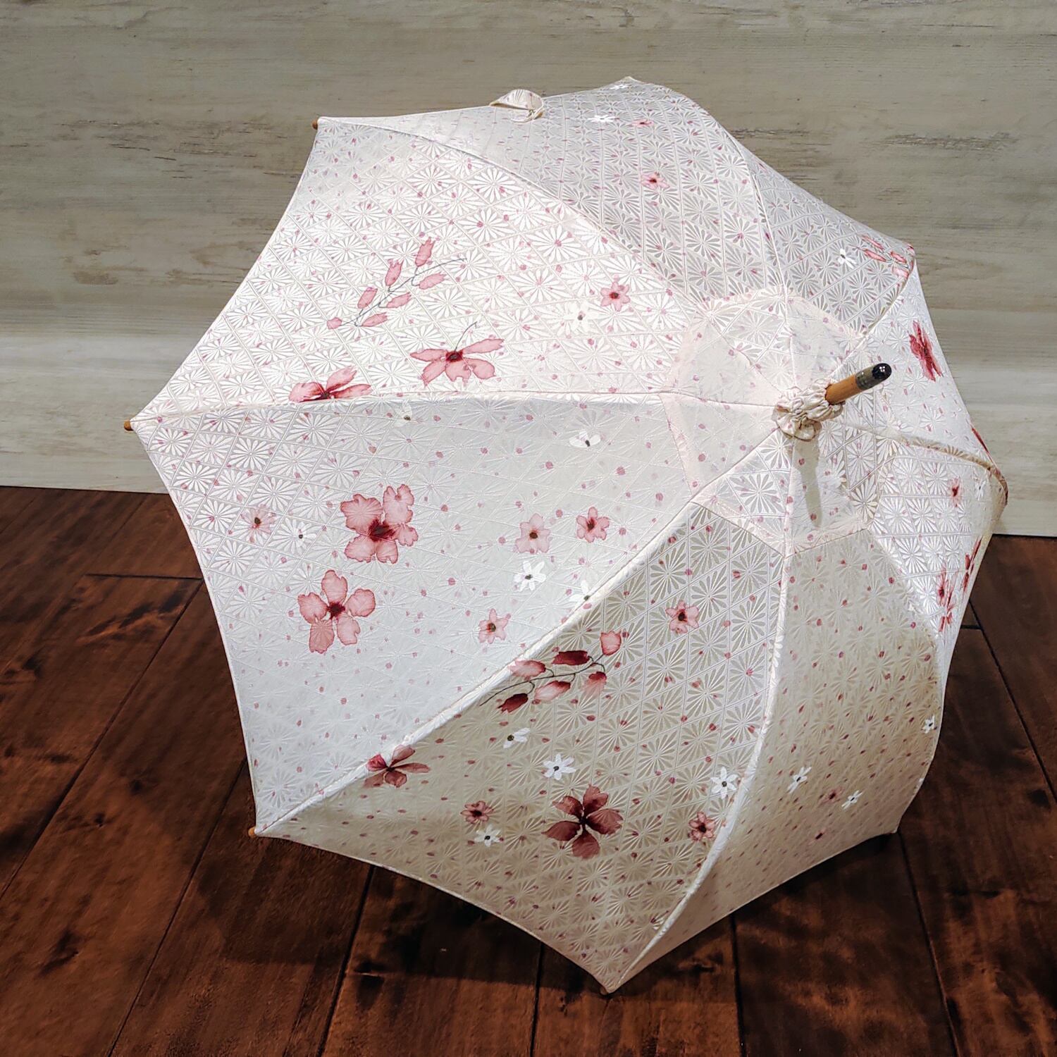 この日傘は、洗練された和のエレガンスを演出する一品です。お洒落な街中やお出かけ先で、周囲と差をつけるアイテムとなること間違いありません。和の美意識を感じさせる花柄と上品な光沢をまとったオフホワイトの生地が、あなたを優雅な気分へと誘います。